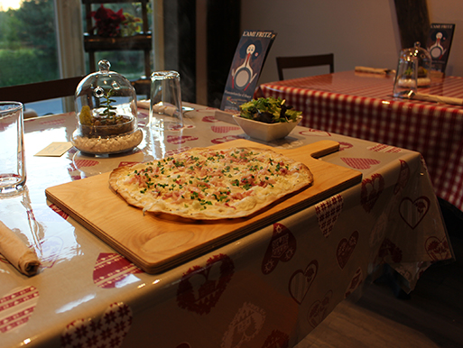 Issu de la tradition paysanne d'Alsace, le Flammekueche (tarte flambée) est un met unique cuit à même la pierre dans un four à bois, ce dernier servait naguère dans les fermes à cuire le pain.