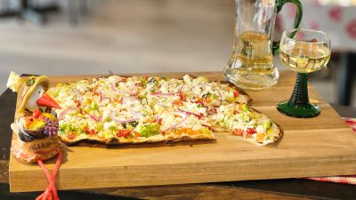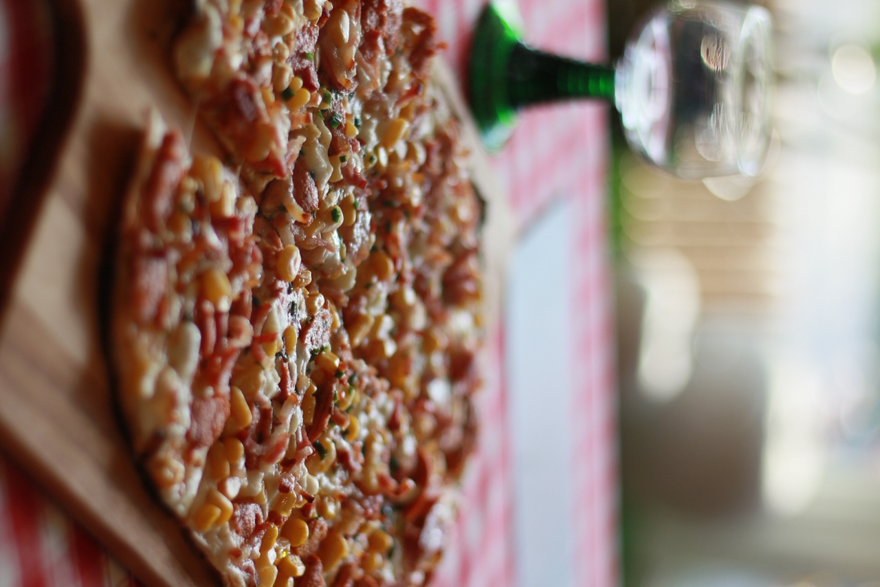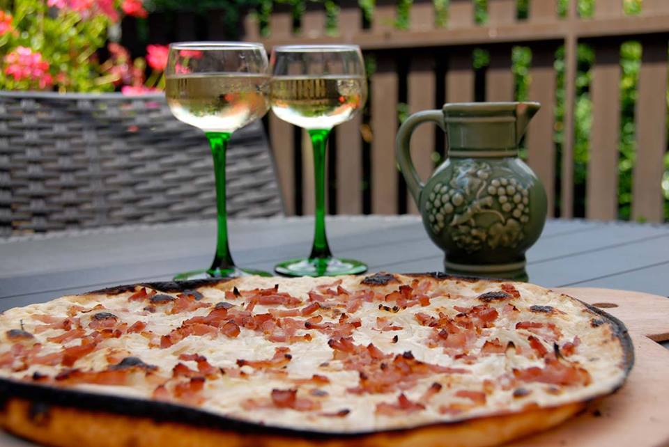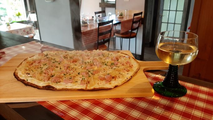 Issu de la tradition paysanne d'Alsace, le Flammekueche (tarte flambée) est un met unique cuit à même la pierre dans un four à bois, ce dernier servait naguère dans les fermes à cuire le pain.