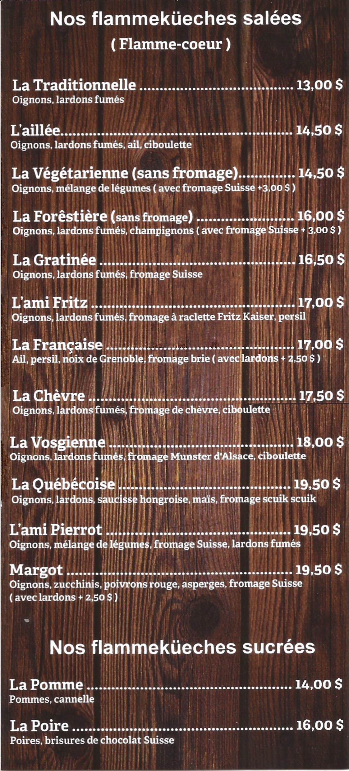 En date d'aujourd'hui, le vrai flammekueche offert dans sa forme traditionnelle n'est servi uniquement qu'au Bistro l'Ami Fritz de Bromont.